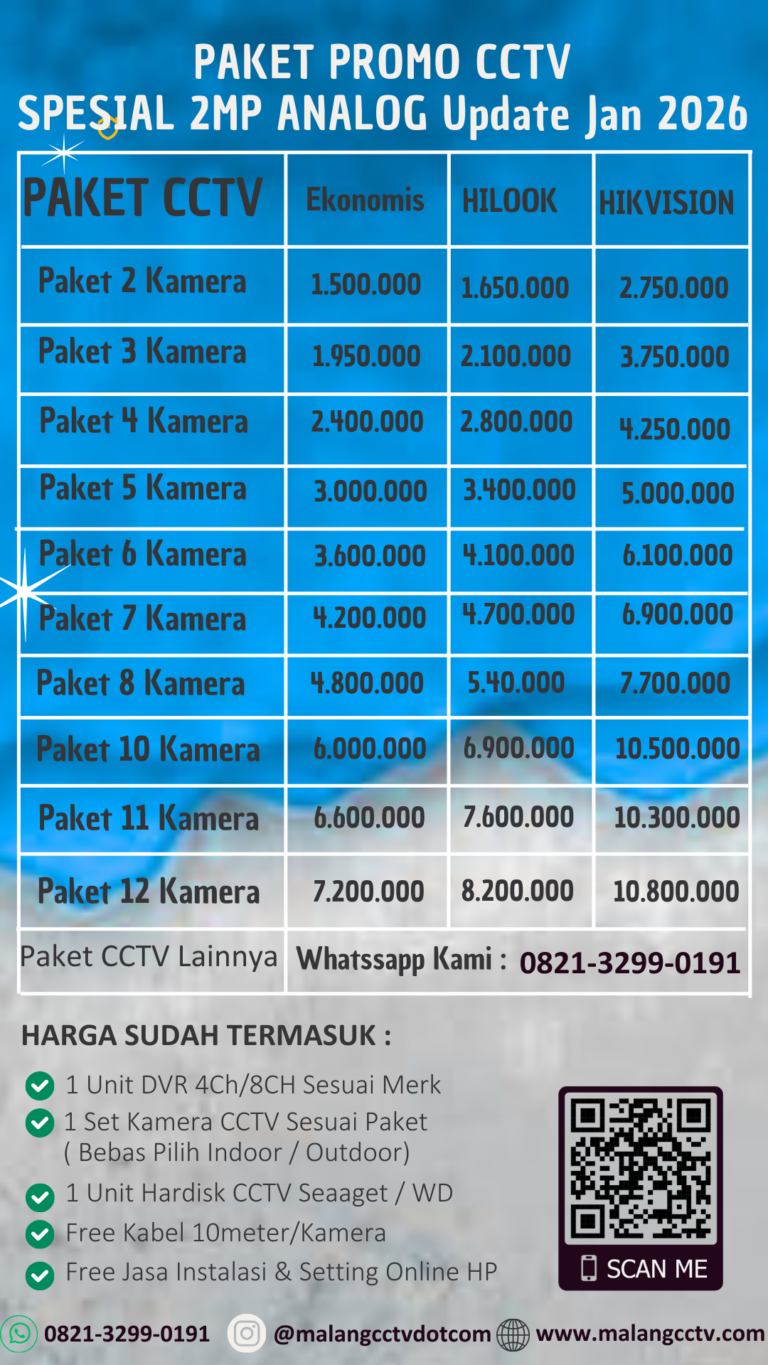 Bisa menyesuaikan dengan lokasi, jumlah kamera, dan budget pelanggan.